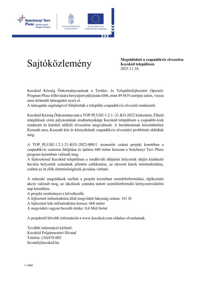 Kedvezményezett: Kecskéd Község Önkormányzata Projekt címe: Kecskéd csapadékvíz-elvezetésének fejlesztése Projekt azonosítószáma: TOP_PLUSZ-1.2.1-21-KO1-2022-00011 Támogatás összege: 49 260 532 Ft Támogatás mértéke: 100% A projekt tervezett befejezési dátuma: 2025.09.30. A projekt tartalmának bemutatása: Kecskéd Község Önkormányzata 49 260 532 Ft 100%-os finanszírozású, Európai Uniós forrásból származó támogatást nyert el csapadékvíz-elvezetés fejlesztésére a településen. A településen jelenleg a legnagyobb problémákat az utakon, járdákon megálló csapadékvizek jelentik, melyeknek biztonságos elvezetése és a helyben történő kezelése, elszikkasztása a cél. A fejlesztéssel érintett terület a Kossuth utca, illetve annak folytatása a Kossuth köz. Tervezett műszaki megoldás: A Kossuth utcában összegyűlő csapadékvíz lefolyása nem biztosított az utca közel vízszintes, az utcában nincs megfelelően kiépített csapadékvíz elvezető rendszer, az utat szegélyező zöld-felületeken szikkad el a csapadék. A Kossuth utca aszfalt burkolattal rendelkeznek, járda nincs, az utca szélessége kb. 16 méter. A Kossuth utca és köz összközműves, víz-, szennyvíz- és gázvezetékek illetve hírközlő és villamos energia légkábelekkel rendelkezik. Helyszín: Kossuth utca – Kossuth köz – Kossuth utca A csapadékvíz elvezetése a lakott területen zárt csatorna kiépítésével történik az útburkolat szélére épített padkafolyóka létesítésével teljes hosszban. A Kossuth köz beépített szakaszát elhagyva, a volt agyagbánya mellett és a Kossuth utca vasúttal párhuzamos szakaszán burkolat nélküli árok építése történik. A befogadó, Vasút utcával párhuzamosan futó meglévő árok kotrása történik a vasút alatti átereszig. A műszaki megoldások mellett a projekt keretében szemléletformálási, tájékoztató akciók valósulnak meg. A projekt eredményei a következők: - A fejlesztett infrastruktúra által megvédett lakosság száma: 161 fő - A fejlesztett kék infrastruktúra hossza: 660 méter - A megvédett vagyon becsült értéke: 0,693 Mrd forint